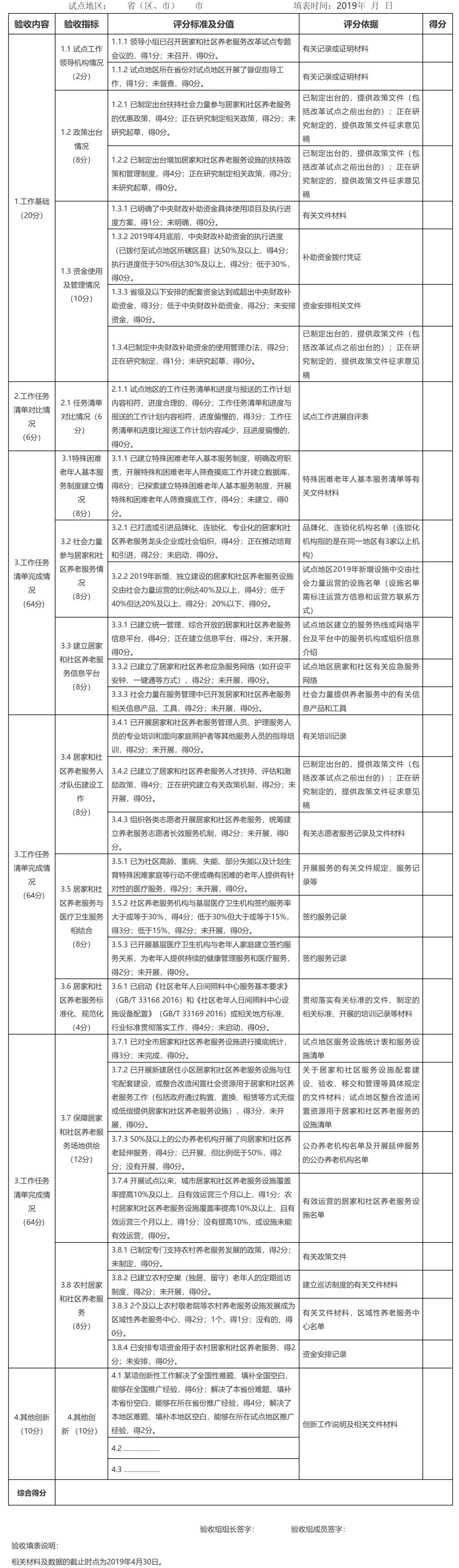 (二)验收内容。试点工作验收内容包括工作基础、工作任务清单对比情况、工作任务清单完成情况和其他创新四个方面。工作基础包括领导机构和工作机制情况、政策出台情况、资金使用和管理情况等三个指标验收。工作任务清单对比情况主要验收实际开展工作任务与试点申报方案任务清单的一致性。工作任务清单完成情况主要验收各项任务完成情况。其他创新主要验收试点地区开展的创新性工作,该项评分需附有关材料和文字说明。每项验收内容细分为不同验收指标,由各地区或验收组按照《2019年第三批中央财政支持开展居家和社区养老服务改革试点工作成果验收评分表》(以下简称《验收评分表》,见附件1)的评分标准和评分依据,对每一项验收指标进行验收评分。